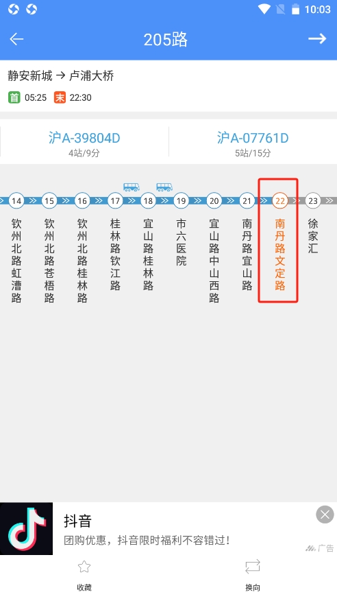 2、比如说205路,可以查看此路公交车所经过的站点以及发车时间;如果是经常乘坐此路公交车的话,可以点击下方的【收藏】;点击【换向】则可以查看静安新城到卢浦大桥的发车时间;