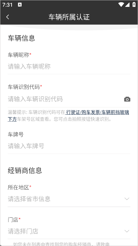 3、来到认证页面后将车辆信息补充完整等待审核