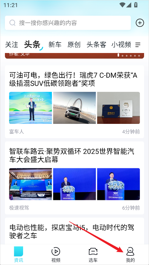1、打开汽车头条App,点击底部导航栏右下角的【我的】;