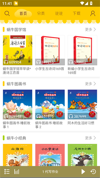 蜗牛壳app最新版是专为家长及孩子量身打造的一款有声早教APP,它涵盖了孩子会接触的各个知识领域,通过有声、可视、互动的形式,将启蒙类、益智类、百科类等图书进行生动演绎,旨在给家长和孩子带来立体式的阅读体验,促进亲子交流,共享温馨时光。同时蜗牛壳app里面的“蜗牛童书”是有声伴读童书品牌,图书至今发行量已超千万册,其丰富内容,精细画面,甜美配音,高清音质和流畅体验,让孩子在立体的阅读空间里收获智慧,收获爱,收获感动。不仅如此,蜗牛壳app还以孩子的视角,为孩子提供真正有爱有关怀的图书,力求做出最富童真、童趣的少儿图书,让孩子在快乐中阅读,在阅读中收获爱与智慧,致力于帮助每一个孩子进行早教学习!