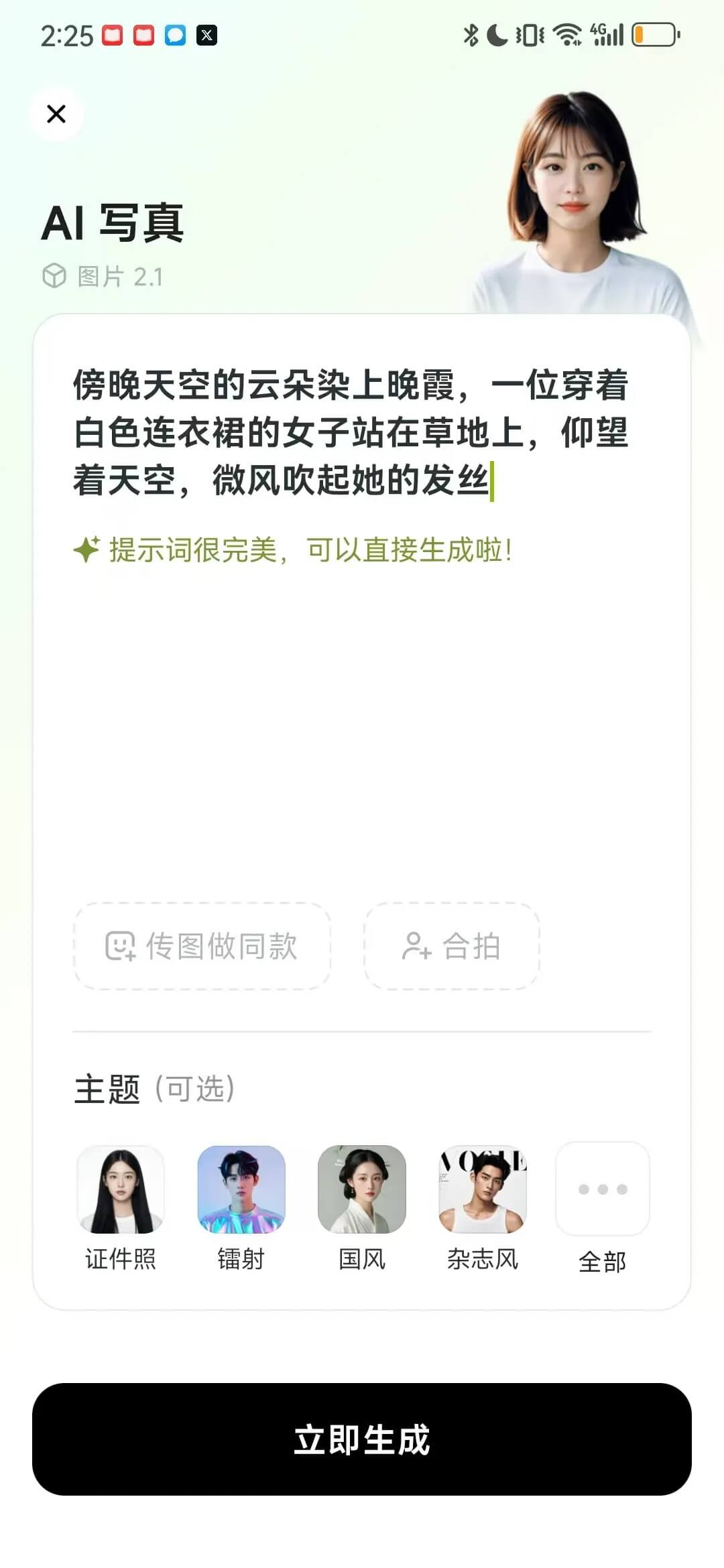 提示词都可以随机出现关键场景自动丰富,下方主题也能选择,至于传图做同款就更有意思了,这个功能可以让你上传任意带脸(可以是二次元),甚至只是一件衣服,都可以作为参考图