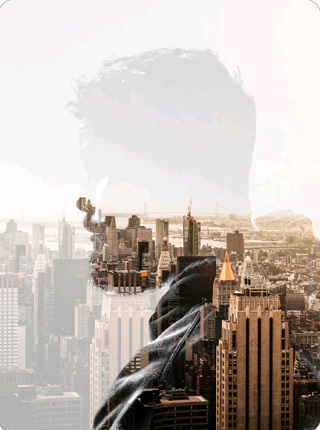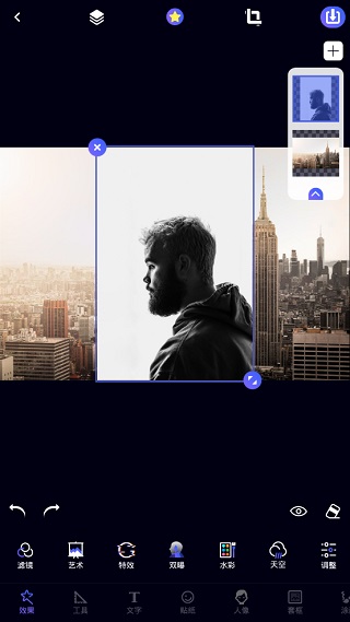 2、首先添加两张照片,人物为底图,城市为混合素材