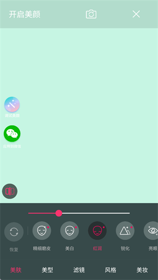 3、调试成功后,回到首页点击开启美颜,点击应用到微信