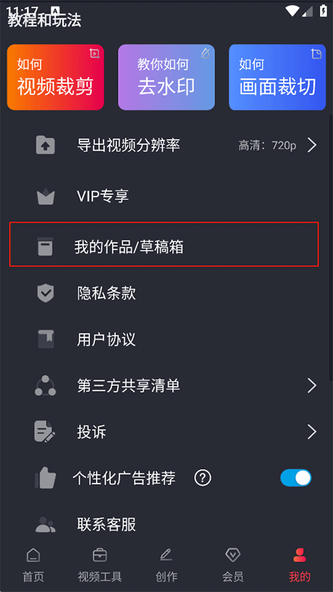 7、导出的视频作品可以在我的-我的作品/草稿箱中查看浏览;