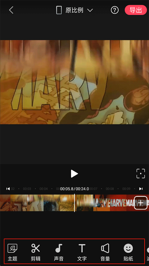 4、下方提供了主题、剪辑、声音、文字、音量、贴纸功能...