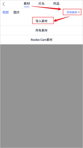 2、点击【所有素材】,选择【导入素材】;