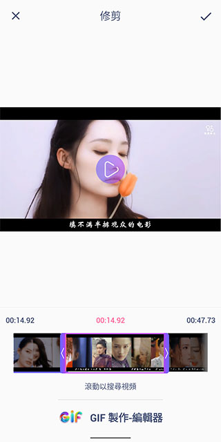 4、处理完成后进入到编辑界面,这时候可以对gif进行编辑,可添加表情,滤镜,以及一些文字,点击视频上的播放可预览效果,完成后点击右上角的对号。