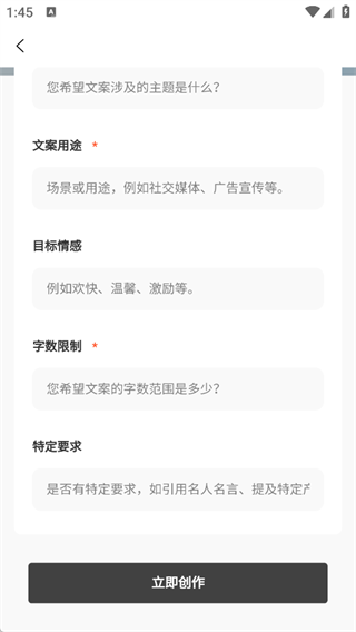 4、使用【AI文案生成】功能时,填写主题、用途、字数等信息,点击【立即创作】即可生成定制文案。