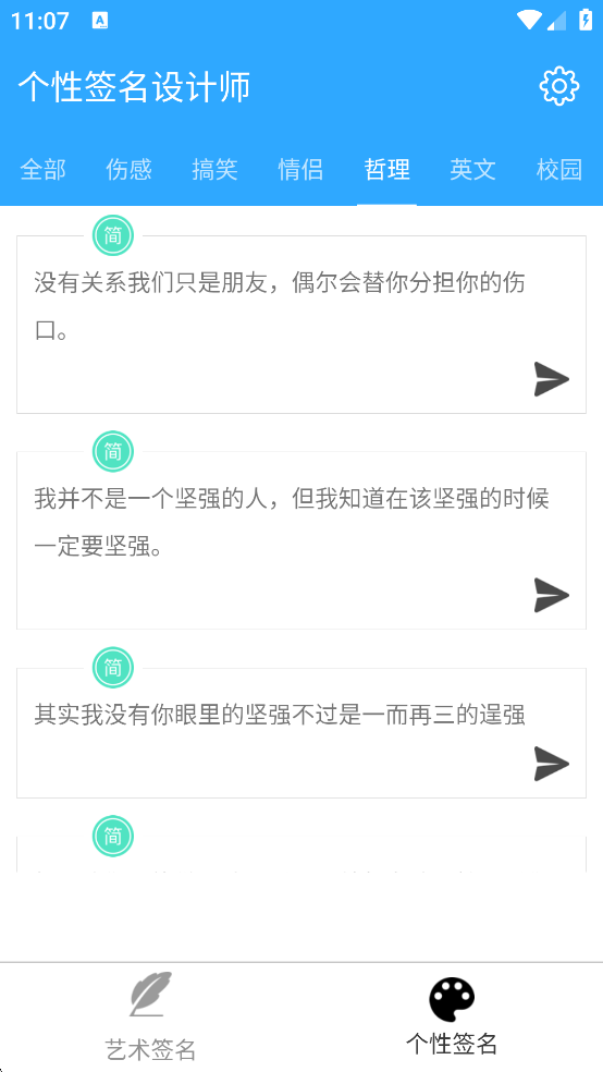 个性签名设计师App是一款具备艺术签名和个性签名两大功能的软件,在这里你可以拥有专属于自己的艺术签,也可以一键复制充满个性的句子来表达自己!