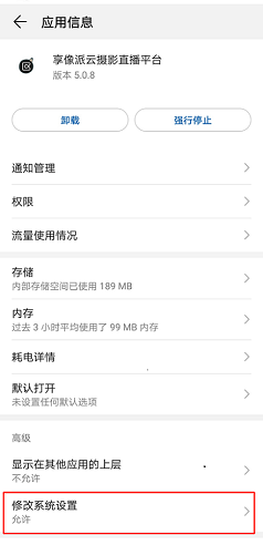 打开步骤:在手机系统设置--应用管理--找到享像派APP--权限管理--修改系统设置--设为允许