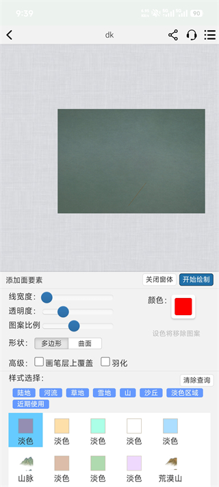 支持调整线宽、透明度等参数,选择陆地、河流等样式,通过多边形 / 曲面形状绘制地图地形区域。