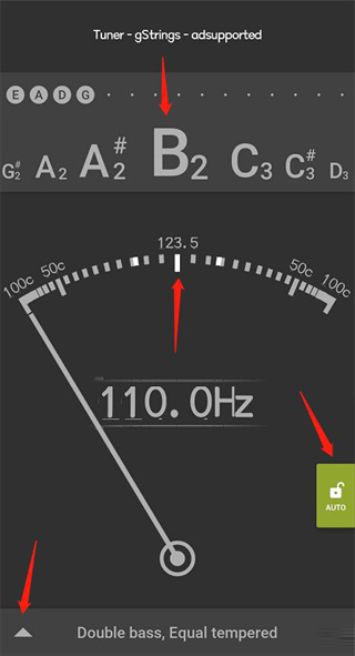 二、当绿色AUTO键或TUNE AUTO键亮起的时候,表示gStrings调音器已经进入到了自动侦测音高的调音模式了,现在将手机的MIC尽量贴在琴面或琴的一侧,放在音龙池音孔下方也可以,这里要注意把刻度表和中间的频率显示区域露出来,得看得见他们才行。