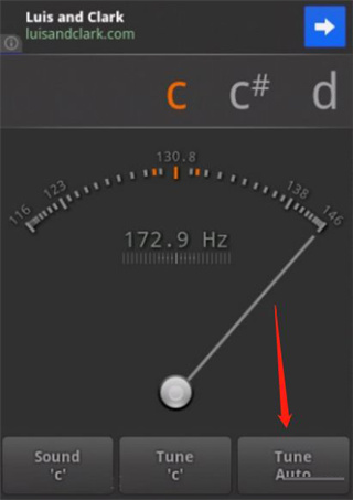 三、接下来散勾一弦,只勾一下就行,指针会摆动起来,待摆动停止后,指针会固定指在一个位置。屏幕上方字母栏正中应当显示“C2”。