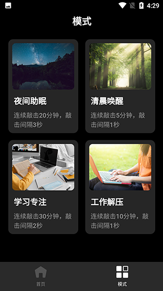 3、点击底部模式,可以根据不同的场景自动播放不同的木鱼敲击效果。