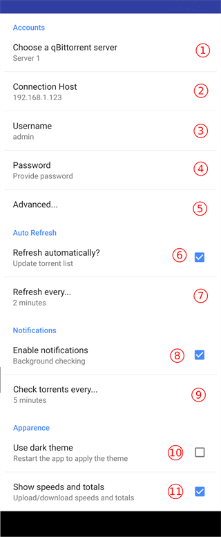 要开始使用该应用程序,请从左侧菜单中选择“设置”来设置 qBittorrent 服务器的设置和帐户,如下所示:
