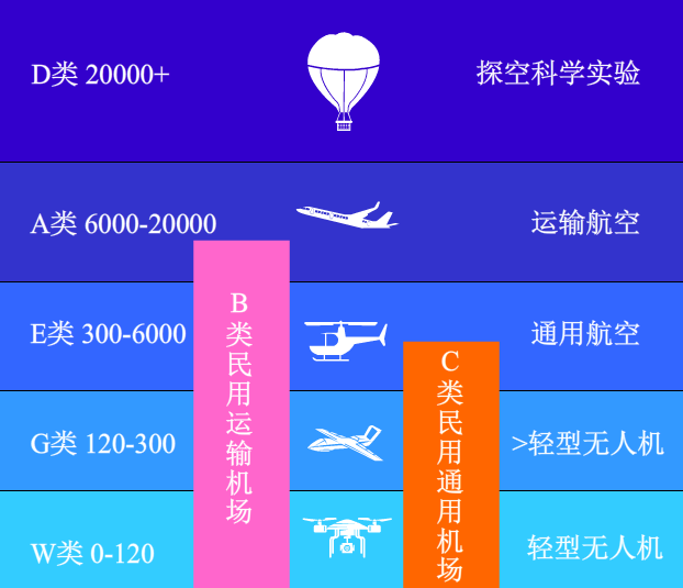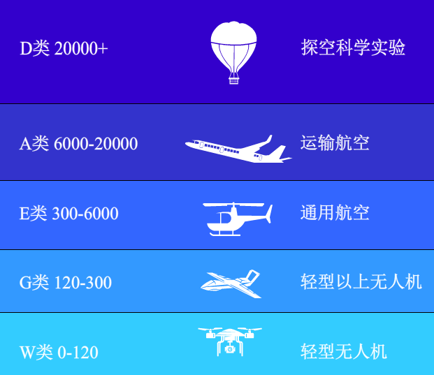 G类 真高120-300米多用于电动垂直起降航空器(eVTOL)、物流、巡检等行业类无人机飞行。