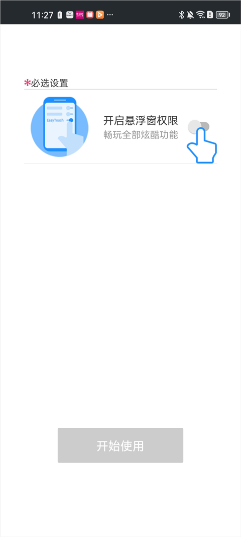 检查手机权限设置,确保EasyTouch已被授权运行,并且没有设置自动弹出等敏感权限。