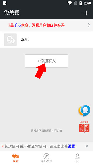 好友定位方法1、点击“添加家人”添加家人为好友,添加后点击该好友的聊天页面,然后点击上方的详细资料选项卡,点击好友的二维码并保存。