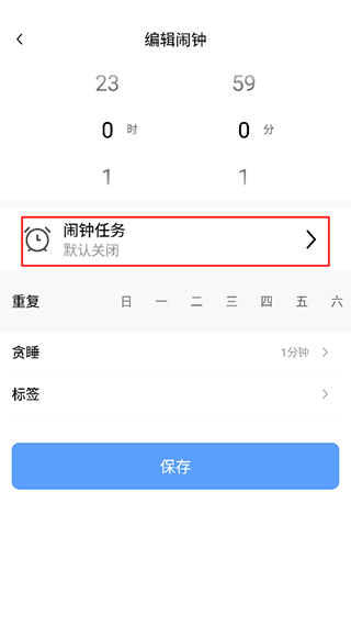 2、可以设置闹钟的时间,重复次数,和贪睡的时间,再点击闹钟任务。