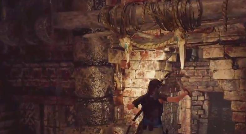 古墓丽影古墓探索完成后利用钩索和攀岩钩越过上方的悬崖,需要在攀岩时学会灵活切换,玩家从阿克雅库古墓中出去的方法是玩家首先冲向横梁,对着横梁按E使用钩索出去。