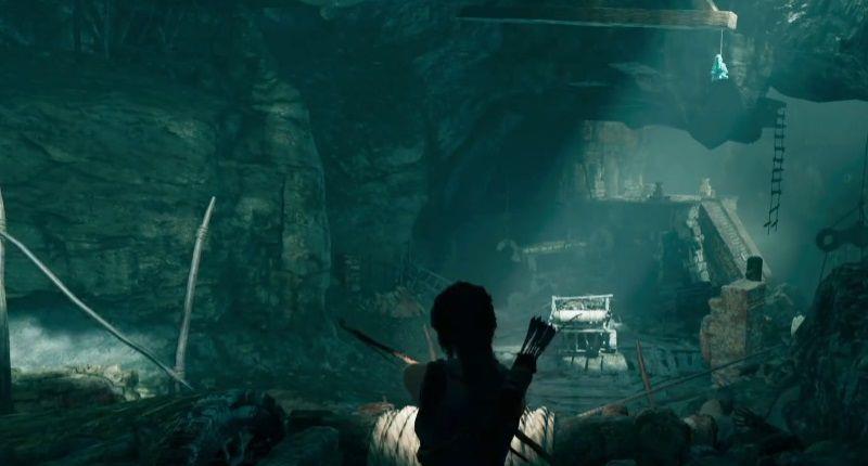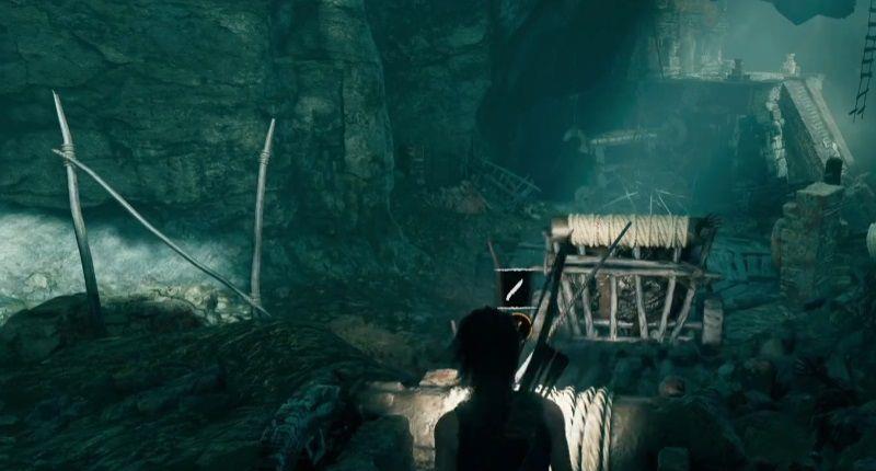 9.走到绳索前,按近战攻击键隔断绳索,推车会滑下斜坡将卡住的吊钟推出去。被推出去的吊钟因其重量将右侧另一个吊钟抬高,这样劳拉就可以利用抬高的吊钟爬上更高的平台。