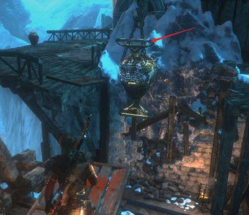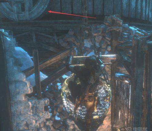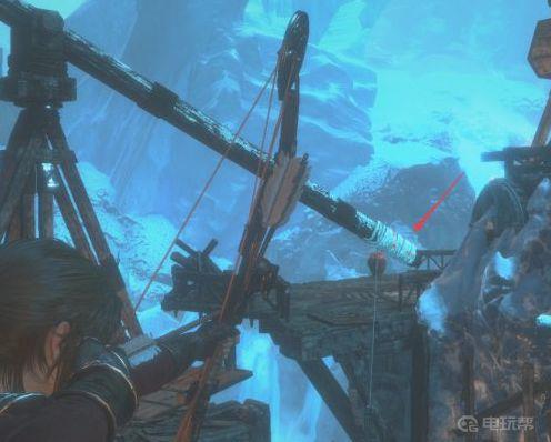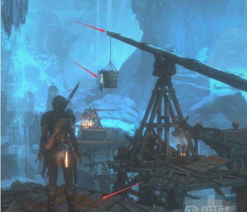 1、来到平台后,使用绳箭把此处的木桶与平衡木的一端相连。