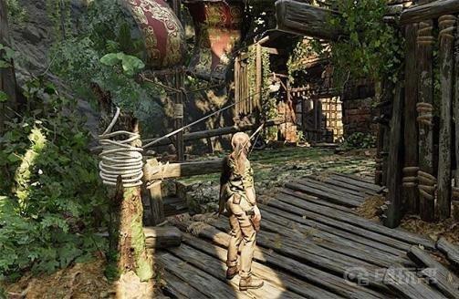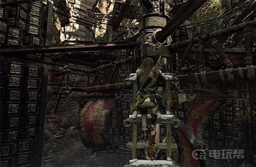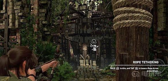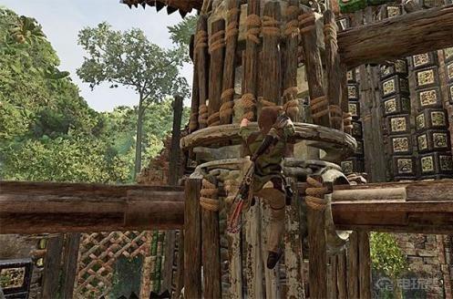 5、站在木结构旁边射击上面显示的绳圈。若如此做,你将破坏木架结构的一部分。检查塔的外部损坏部分,你会发现图片上显示的是圆形杠杆。尝试用绳箭击中它。Lara将能够拉动它,在短时间内打开正确的通道。