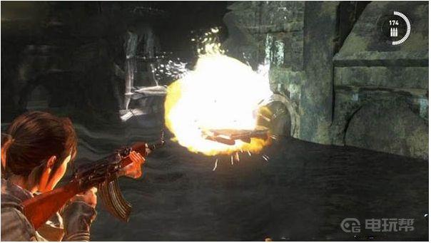 9、当水位回落,木板朝右边漂过来,抓住时机,在它经过那道闸门时射爆它,释放水流。水位提升第二次。当然,身上有榴弹箭的话就省事了,直接炸掉闸门,不用这么大费周章。