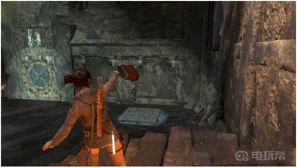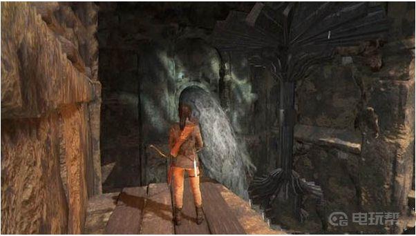 2、爬下竖井进入黑暗的洞穴中,往前走去听到水流声。来到如图位置,纵身跳到右边的石壁上,沿石壁爬下去,落身到下方洞穴里。