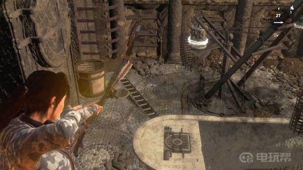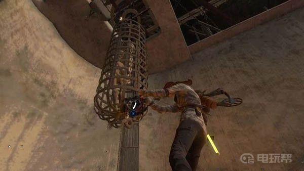 5、走到毒气闸门的右侧,回身利用绳索拉动起重机使之旋转,这样将铁笼置于铁栅门的前面,仍和闸门保持一条直线。