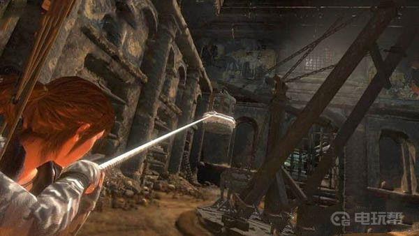 6、再次拉动上方的两支拉杆释放毒雾,快速沿楼梯跑上去,站到如图位置朝着屋里的毒气射火箭。如此,爆炸的力量将铁笼打飞,撞开藏宝室的铁门。进入藏宝室,阅读手抄本习得技能“希腊火”。