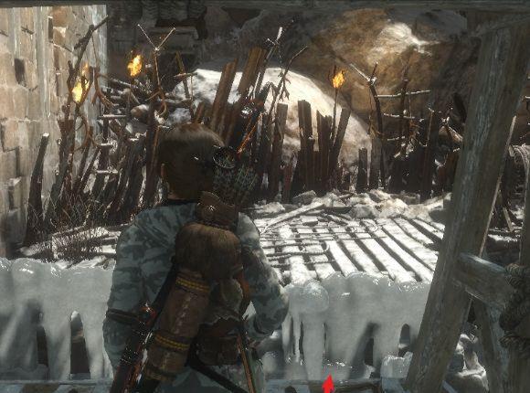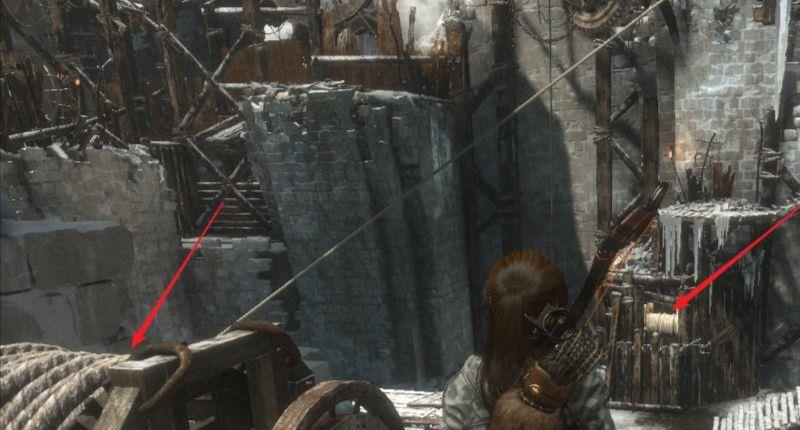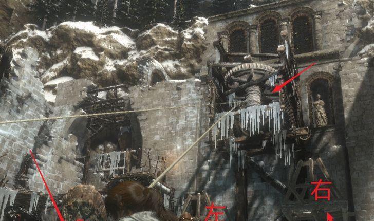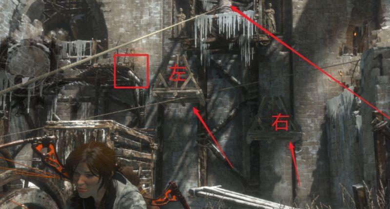 7、用绳箭相连远近两处转轮,完成后便返回一层平台中间的转轮处,但要返回到此处,就要通过方框处的平台跳到相连的线索上,攀爬回到此处,这步很关键。
