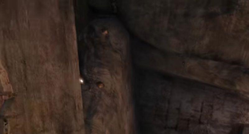 3.走到前方有火的地方,左边会出现一个被坍塌石头盖住的缝隙,蹲下身子,从缝隙里通过,一直往前走即可,缝隙里没有其它岔路
