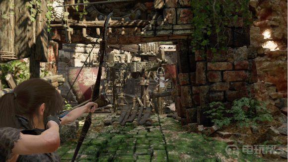 8、回到转轴平台,先用绳索箭矢将封堵升降门拉环开关的木条扯掉。然后到一个固定的线桩处,用绳索箭矢将拉环开关固定。