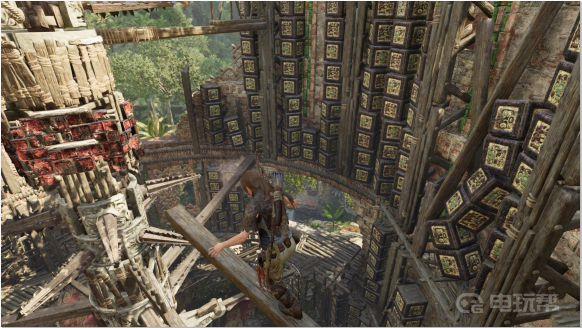 2、回到遗迹前,从左侧石台跳爬上遗迹第一层。从右侧下去,沿着木条向右移动到另一个平台。通过木梁到达对面,从前方岩壁降到下一层。