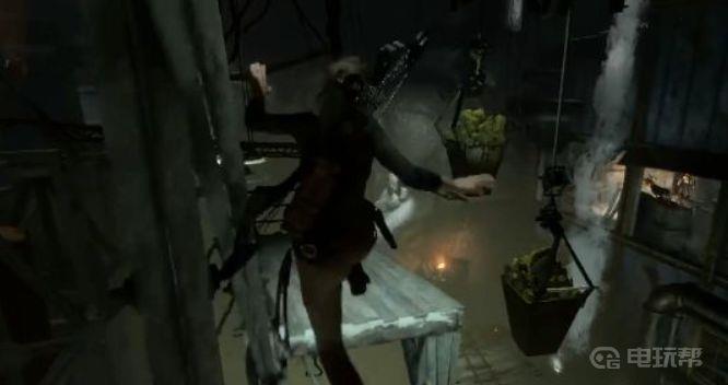 3、从营火出发跳到对面有一个小平台,提示我们烧掉被水流挡住的破布。
