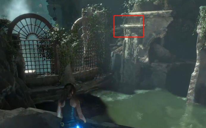 4、铁栅栏旁边的墙是可以跳上去的,但是需要借助刚刚打下来的木板,但是现在水位低没办法上去,这个时候回身再跳到吊着的木板上,稍微站一会,等着水闸冲水,能把你冲到水池里面。