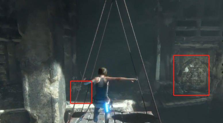 1、进入洞穴之后往上看能看到有两个木板,左边倒吊着的是可以打下来的,瞄着发白光的箱子,用手枪打一下就能把木板打下来。