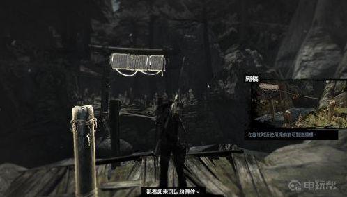 4、到达上面以后继续前进可以来到断崖之间,这里可以按教程搭建绳桥,把绳索射过去对面绳索圈那就可以了。劳拉会自动把绳子另一头插在柱子上,注意以后要遇到这种柱子才能搭建绳桥哟。