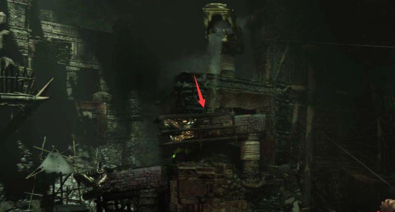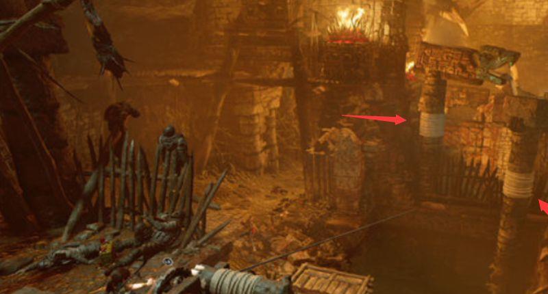 1、首先我们通过岩壁降到下方,来到目的地-巨蛇之眼,这里的关键是打开两扇封闭的滚轮大门。