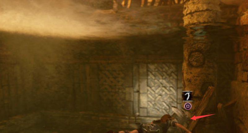 5、然后我们用绳索箭矢将转盘与最高处的龙头转轴相连,旋转龙头朝向劳拉方向,再用绳索箭矢将转盘和下面的龙头转轴相连,旋转龙头朝向左侧。使水流入下面的龙头水槽中,让水流到左侧水车上,将其启动。