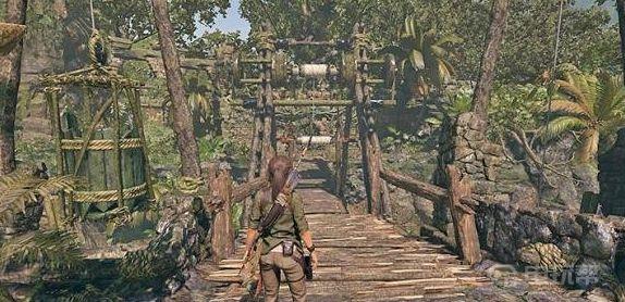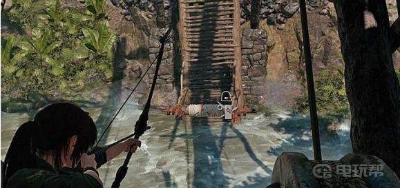 5、瞄准图中所示的绳圈。如果你以正确的方式射击,绳索将会连接起来,可以返回并轻松到达桥的另一端。