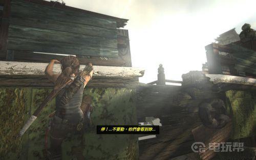 3、解决掉之后继续前进,注意在跳过断路后劳拉遇到敌人,而且自己会因为虚弱进入频死状态,所以我们可以现在掩体后回复一下再应战如果不是可能会被一两发子弹给打死。之后在转角处还会遇到一名手持冲锋枪的敌人,干掉以后用绳索把飞机甲板拉下来。