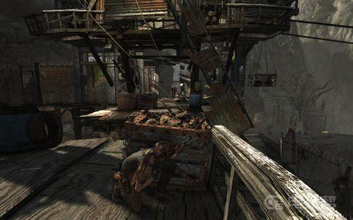 2、经过一段水路以后与敌人碰面。如果不想立刻正面开战的话,可以现在通道口把楼上的敌人射死,然后等大门处的敌人聊完天以后再逐个暗杀。从这里开始注意下地面,凡是有白布包裹着杂物的都是陷阱,踩上去会被吊起来。