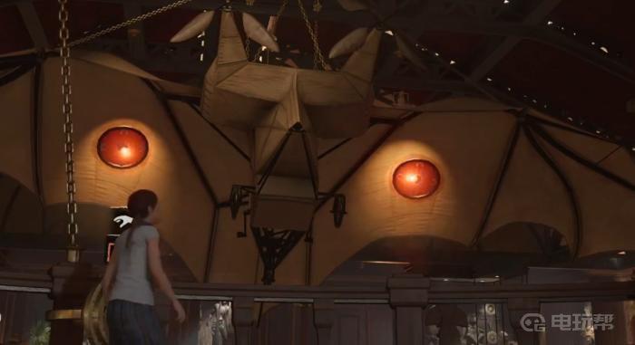 5、来到二楼,找到轮轴并转动,让天花板上的蝙蝠展开双翼,光正好从两侧透下去。
