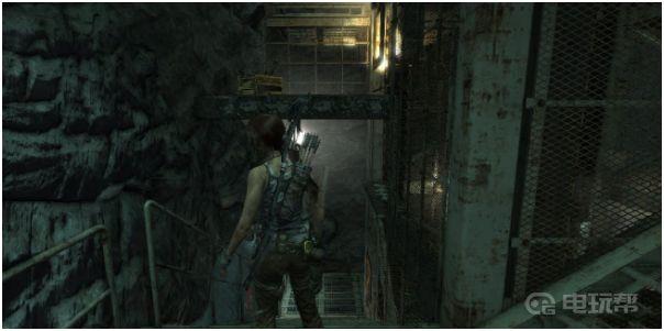 7、让电梯停在3层,然后下楼梯向2层走;在通往2层的中途靠里边可发现头上有一处平台,劳拉需要跳上去。