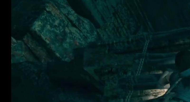 2、在走廊滑索下来的位置,从断崖处可以攀爬下去,用钩斧降到下方再摆荡到走廊下方的秘密地点。从另一端岩壁可以攀爬回上方走廊。