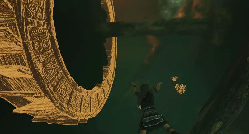 5、上岸后用绳索箭矢将转轮和岸上的转盘连接,通过转盘将转轮缺口位置旋转至下方,这样就可以从水下通过了。