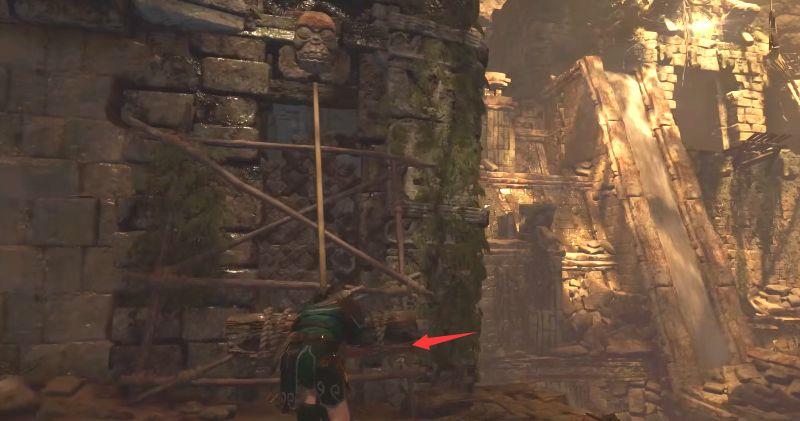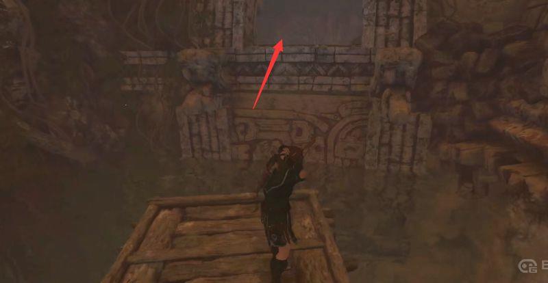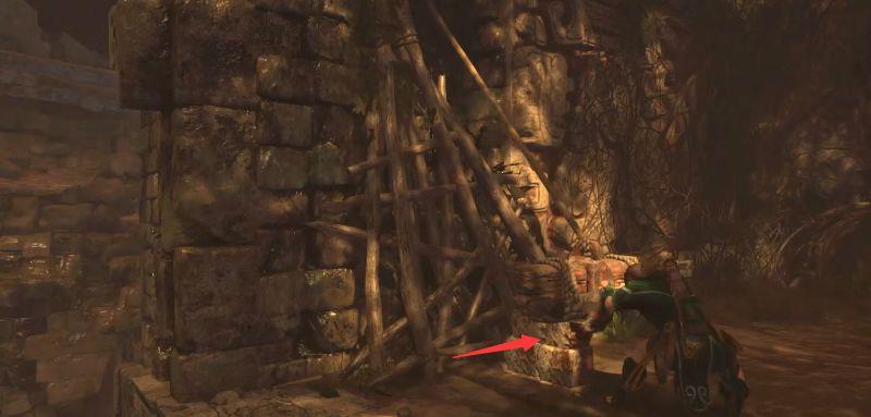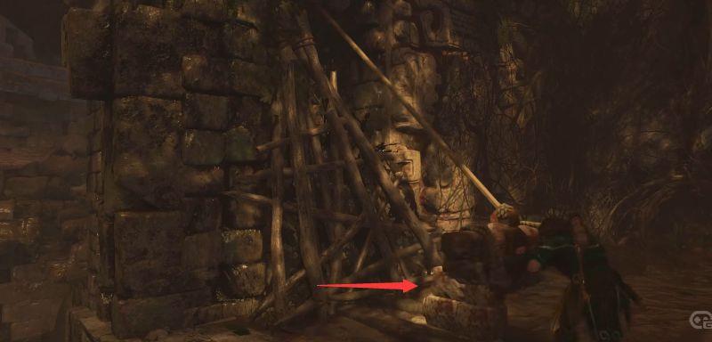 1、来到古老水道古墓的入口处,我们目的地是要进入箭头所指平台上的门口。