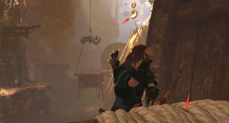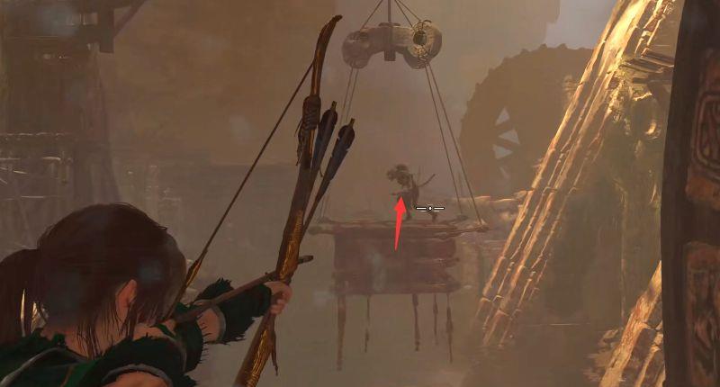 16、站在木筏上,用绳索箭矢将木筏和前方水车转轴相连。木筏会被拉近水车,在靠近后跳上水车转轴所在的高台。